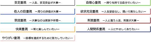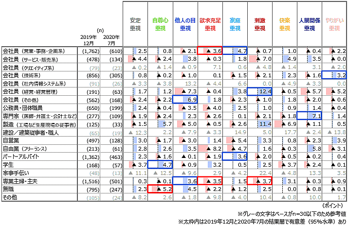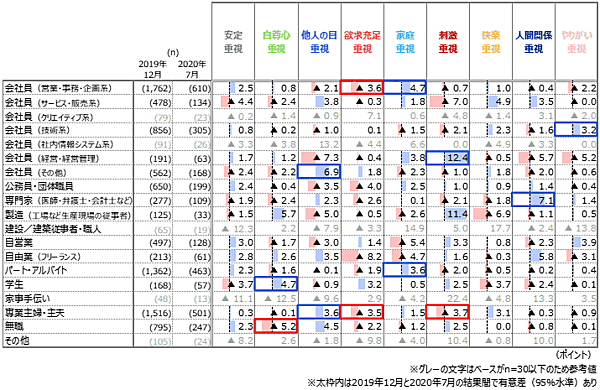 職業別でみると、「会社員(営業・事務・企画系)」では「家庭重視」層が4.7ポイント増加した一方で、「欲求充足重視」層が3.6ポイント減少している。一方「会社員(経営・経営管理)」では「刺激重視」層が12.4ポイントが増加している。「パート・アルバイト」では「家庭重視」層が3.6ポイント、「学生」では「自尊心重視」層が4.7ポイント増加するなど、職種でかなりの意識差が見られる。