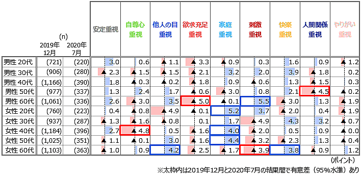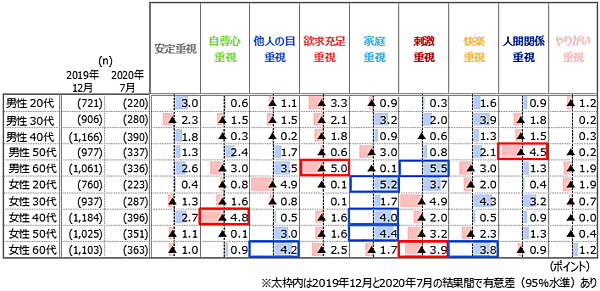 性年代別でみると、女性20代・40代・50代で「家庭重視」層の割合が増加。男性では60代で「刺激重視」層が5.5ポイント増加した一方で、「欲求充足重視」層が5.0ポイント減少している。