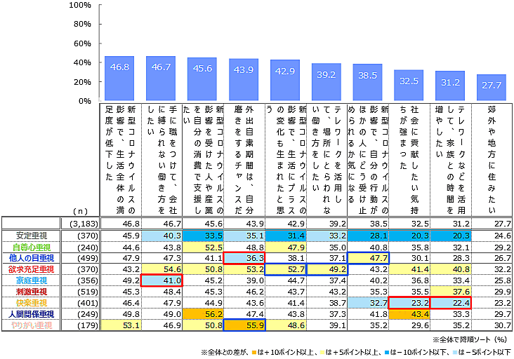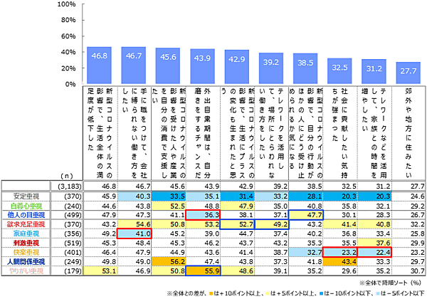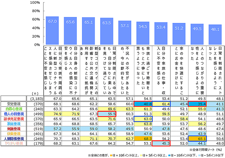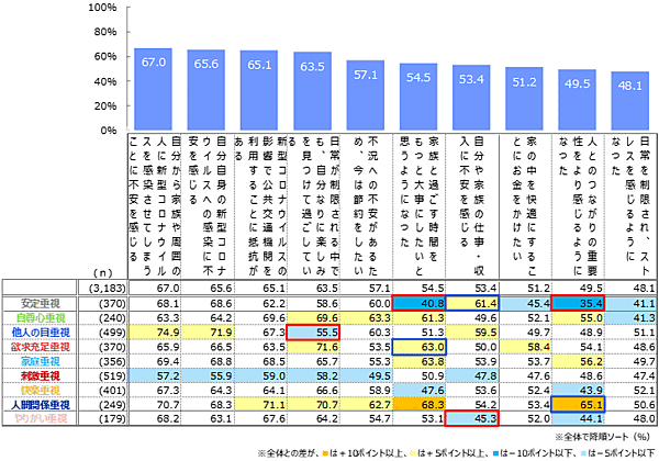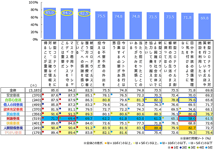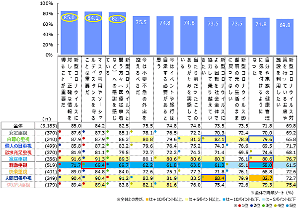 ただし、9つの「人生価値観」別で見ると、「他人の目重視」層では「マスク着用やソーシャルディスタンスを守ることは重要だ」87.2%が「新型コロナウイルスに対して、正確な情報を得ることが重要だ」85.8%を上回る。また「刺激重視」層では、トップ3項目それぞれが全体と比べて10ポイント以上低い。「人生価値観」によって、感謝、健康管理、協力といった意識に、かなりの差があると思われる。