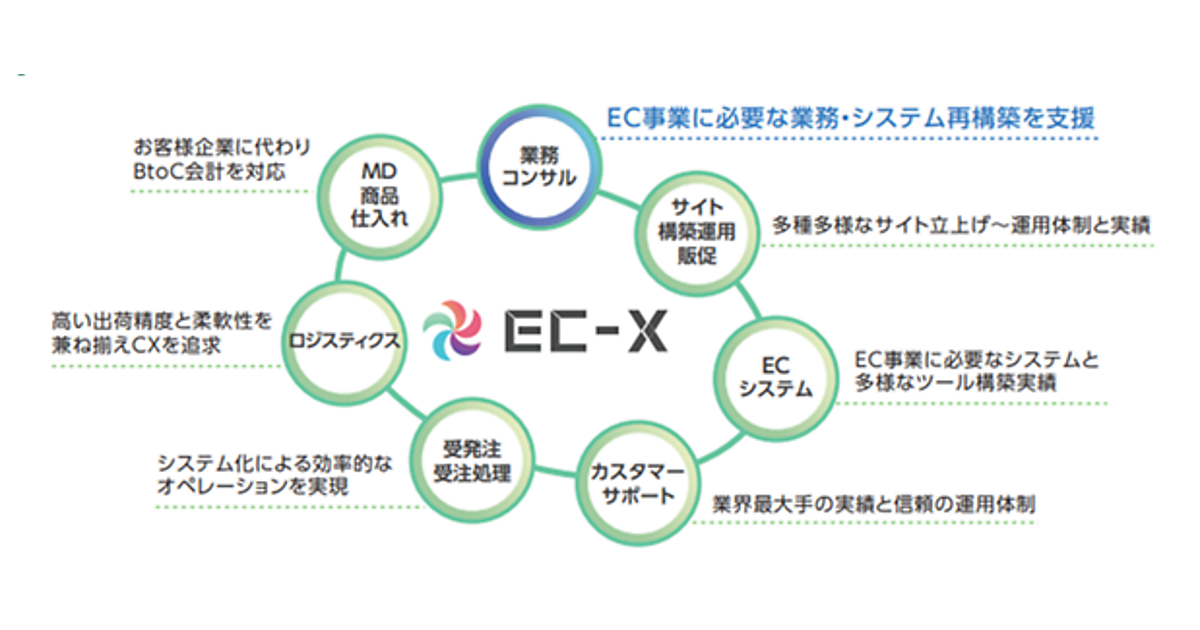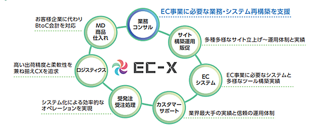 事業規模や、EC事業を企業内でどう位置づけているかを考慮し、売上の拡大▽新規立ち上げ▽事業の再構築など、支援メニューを多数用意した。コンサルティングだけでなく、ECシステムの構築▽委託業務の切り分け▽マーケティング戦略▽カスタマーサポート▽配送など、EC事業を総合的にサポートする。