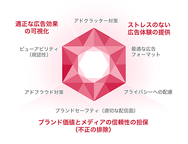 ヤフーは広告品質のグローバルスタンダードを参考に「広告品質のダイヤモンド」を独自に定義している。今回の対策は三つの価値のうちの一つの「ブランド価値とメディアの信頼性の担保(不正の排除)」に寄与し、六つの対策項目として掲げる「アドフラウド対策」と「ブランドセーフティ(適切な配信面)」に相当する。