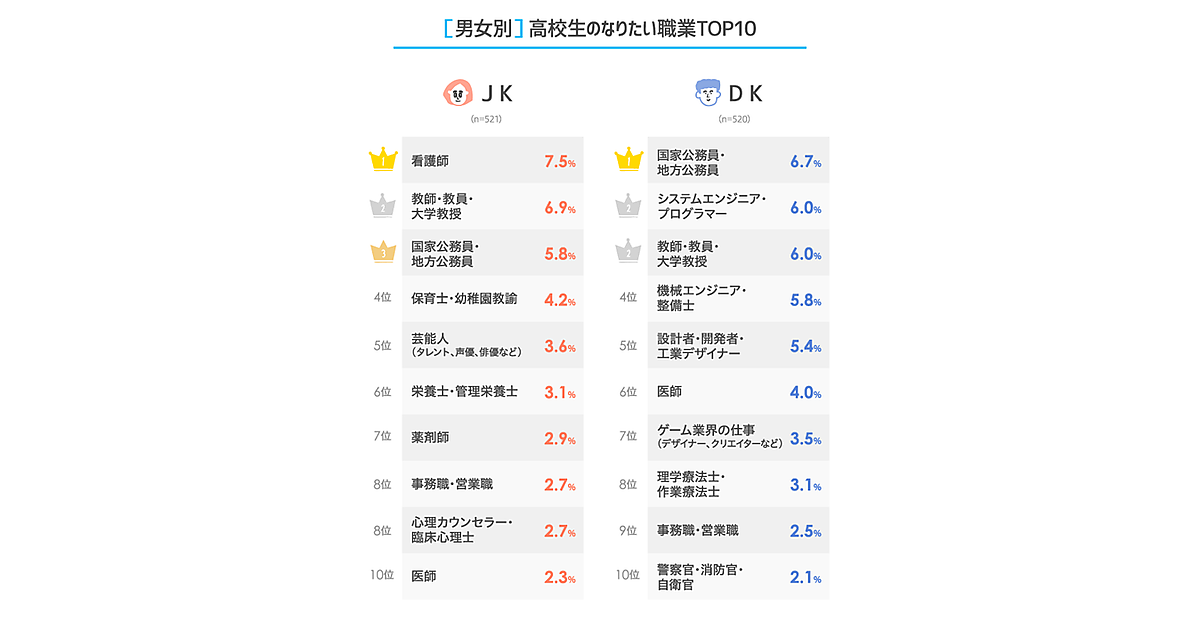 まず高校生全体に「あなたが将来いちばんなりたい職業は?」と聞くと、女子高校生(JK)1位は「看護師」7.5%、男子高校生(DK)1位は「国家公務員・地方公務員」6.7%だった。JK・DKに共通して、“国家資格”が必要な職業が多くあがると同時に、「人の役に立ちたい」という意識を感じる職種が多かった。