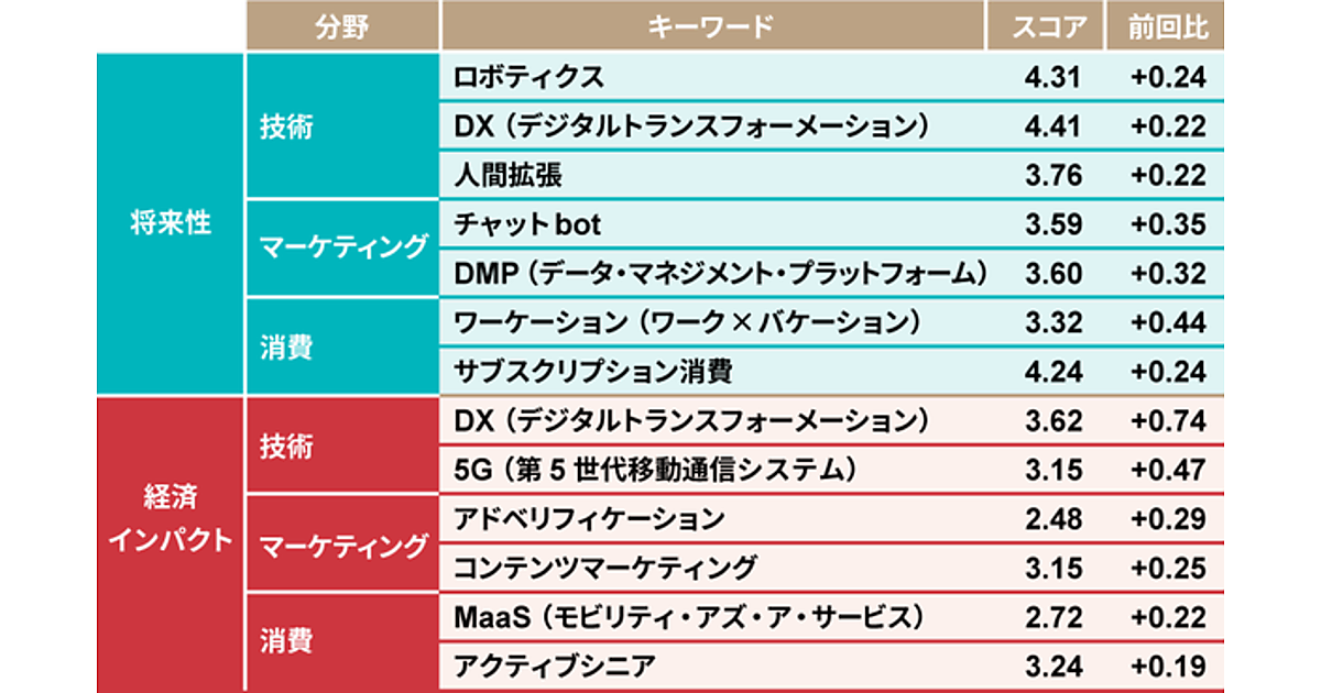 「経済インパクト」では「DX」に加え、「5G」「アドベリフィケーション」「コンテンツマーケティング」「MaaS」「アクティブシニア」といったワードが並んだ。