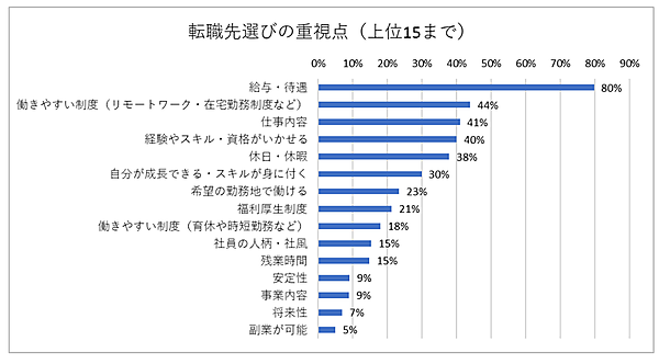 「転職先選びの基準」については、「給与・待遇」80%が圧倒的だが、「働きやすい制度(リモートワーク・在宅勤務など)」44%がそれに続いた。「働きやすい制度」は、2020年2月の前回調査では13%(8位)だったことから、大きく増加した。