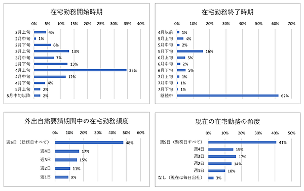 続いて、新型コロナ感染拡大による勤務形態の変化を探った。2020年2月以降について「在宅勤務経験の有無」を聞くと、「経験した」76%で、開始時期では緊急事態宣言が出された「4月上旬」35%がもっとも多かった。現在も在宅勤務を継続している人は62%だった。