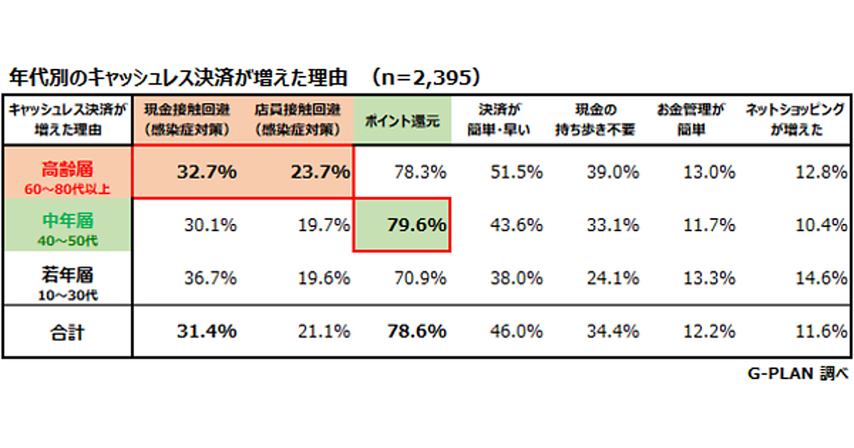 「キャッシュレス決済が増えた」理由を、「増えた」「新たに使い始めた」と回答した2,395人に複数回答で聞くと、「ポイント還元」78.6%が圧倒的多数だったが、「現金接触回避(感染症対策)」31.4%という声も多かった。この数値は10~30代では36.7%、60~80代以上では32.7%と、全体平均より高くなっている。若年層と高齢層ほど、「感染症対策」を意識してキャッシュレス決済を使っていたようだ。