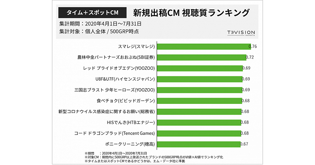 TVISION INSIGHTSは、「新規出稿CM視聴質ランキング(2020年4月~7月)」を発表した。独自に計測した“視聴質”をもとに、視聴者がどんなCMを注視していたかを推定している。