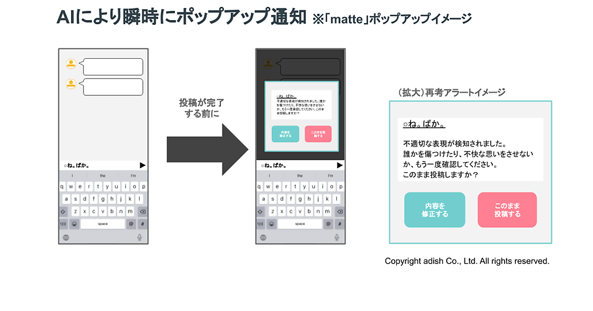 投稿内容をmatteが取り込んでAIが瞬時に判別し、不適切と懸念される投稿の場合はユーザーが投稿する前にアラートをポップアップで通知する。運用しながら収集したデータを基に利用者検証を繰り返し、ユーザーが投稿を萎縮することがないよう最適な内容を提案し続け、継続的にポップアップを最適化していく。