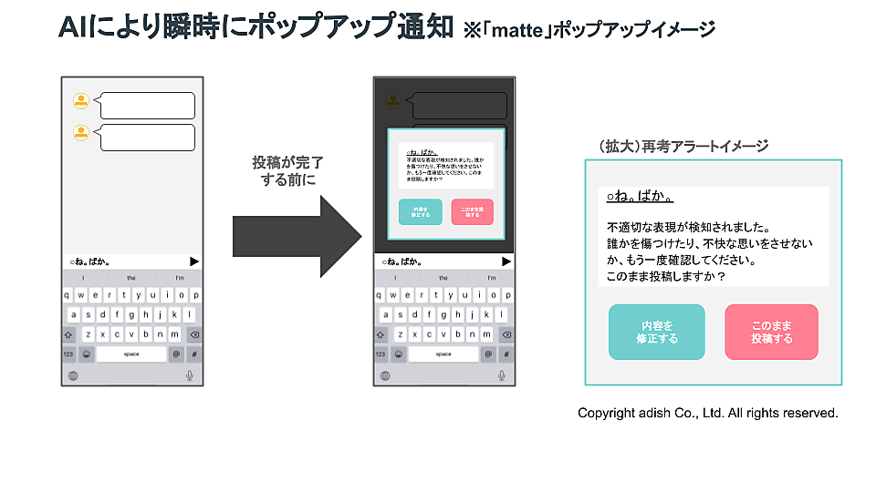 投稿監視やサポート代行、SNS運用代行などを展開するアディッシュは、投稿者がSNSなどインターネット上に投稿する前に内容を再考するアラート機能を装備したAI(人工知能)検知サービス「matte(マッテ)」を開発し、9月15日から提供を始めた、と同日発表した。不適切な投稿内容を検知して未然にトラブルを防止する。