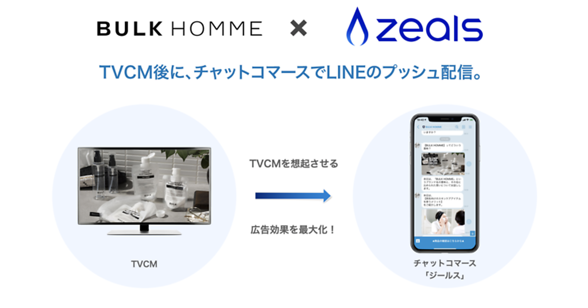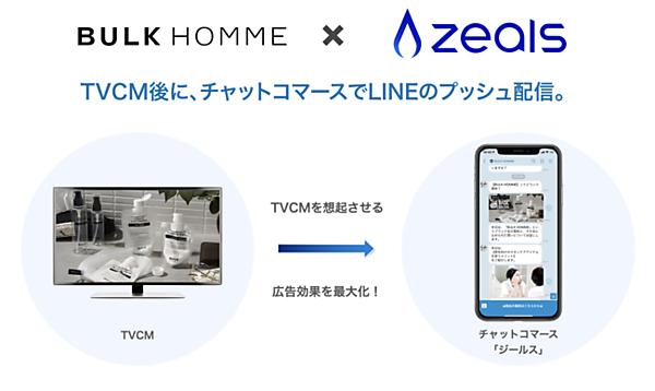 チャットコマース「ジールス」は、AI(人工知能)が会話しながら商品を案内するサービス。化粧品の企画、販売のバルクオムが5月12日から始めたメンズスキンケアブランドのテレビCMと連携し、バルクオムのCMの放送時刻に合わせて、ジールスでプッシュ配信した。通常のLINEプッシュ配信と比べてCVR(成果達成率)が918%向上した。
