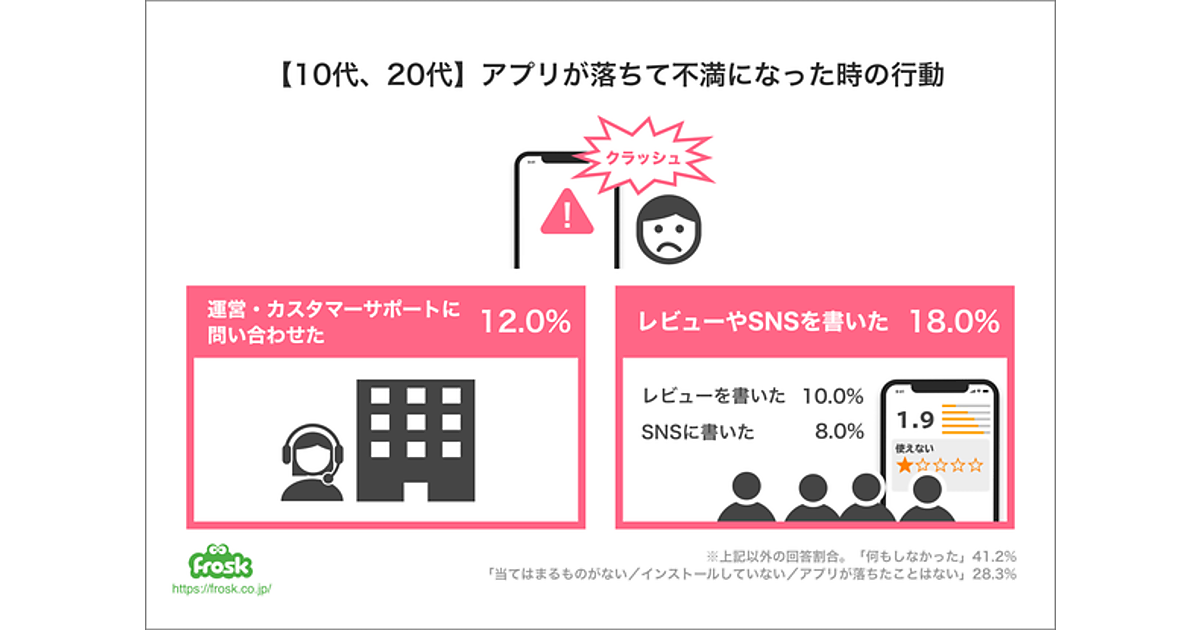 そして、こうした現象(アプリクラッシュ)が発生したとき、10代・20代はどう振る舞うのか? 「アプリが落ちる経験をして不満になった際に取った行動」を聞くと、「運営・サポートに問い合わせた」12%に対し、「レビューを書いた」10%、「SNSに書いた」8%と、合計18%で、問い合わせを上回っている。この数値を見る限り、問題解決より情報公開・共有に意識が向かうのが、若年層の振る舞いと考えられる。アプリ開発者にとっては、懸念すべき状況だろう。