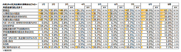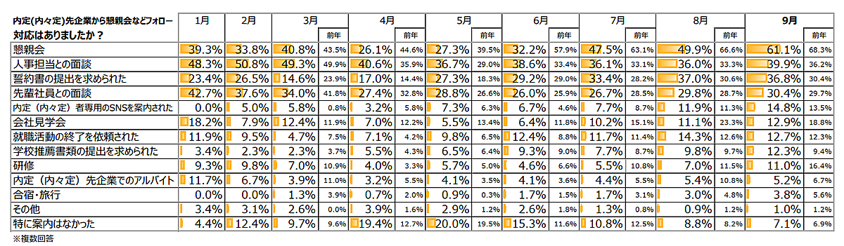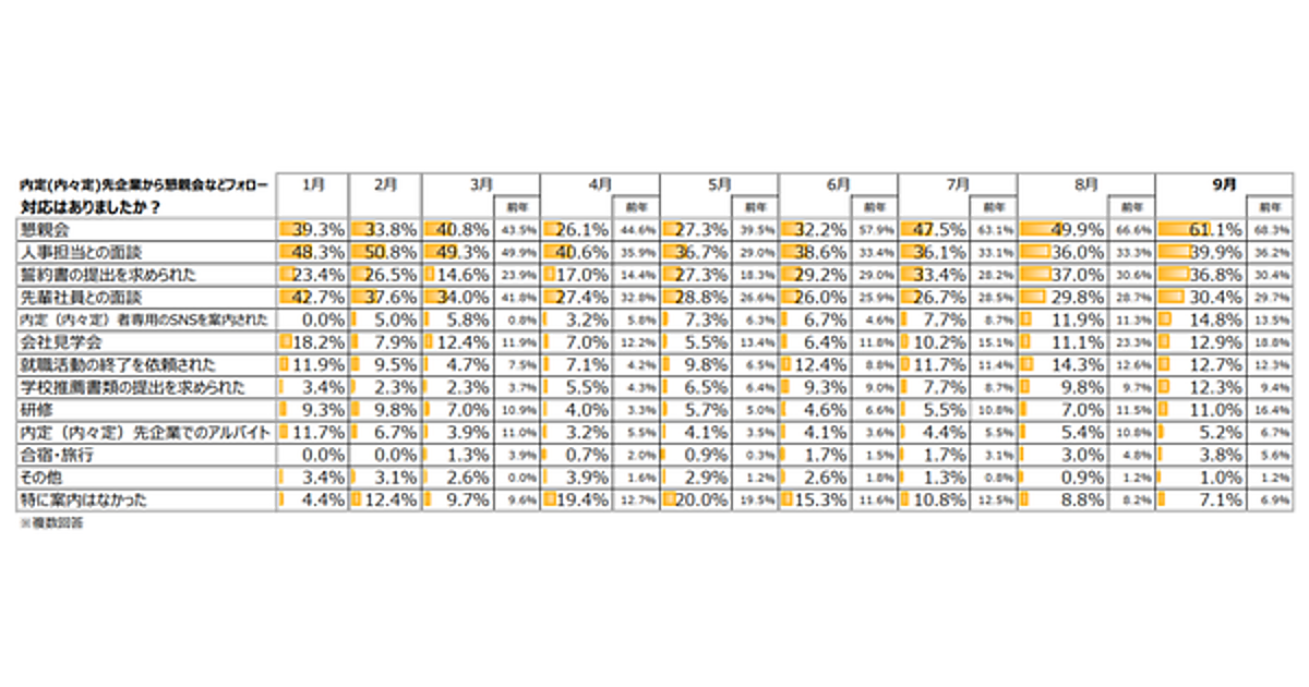 また、「内定(内々定)先企業からのフォロー対応」について聞くと、「懇親会」61.1%が8月から大幅増。コロナ禍は続いているが、徐々に学生とのコミュニケーションを増やしていると考えられる。前年との比較では、3位の「誓約書の提出を求められた」がプラス6.4ポイントと大きく増加していた。