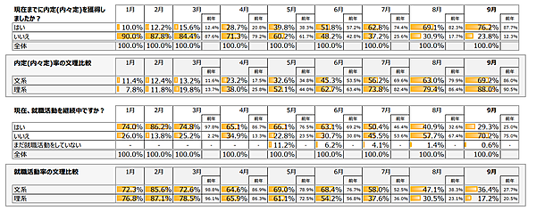 文系・理系を比べると、内々定率は文系が69.2%(前年同月比マイナス16.8ポイント)、理系が88.0%(同マイナス2.5ポイント)で、文系が前年から大きく遅れていることが判明した。就職活動率でも文系の遅れが目立つ。