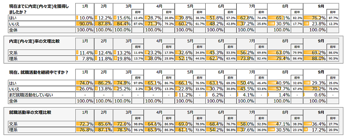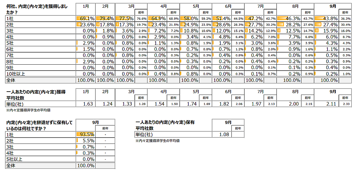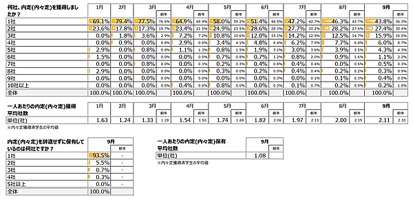 9月時点の内々定率は76.2%で前年から大幅減、内定獲得社数は2.11社でほぼ前年並み