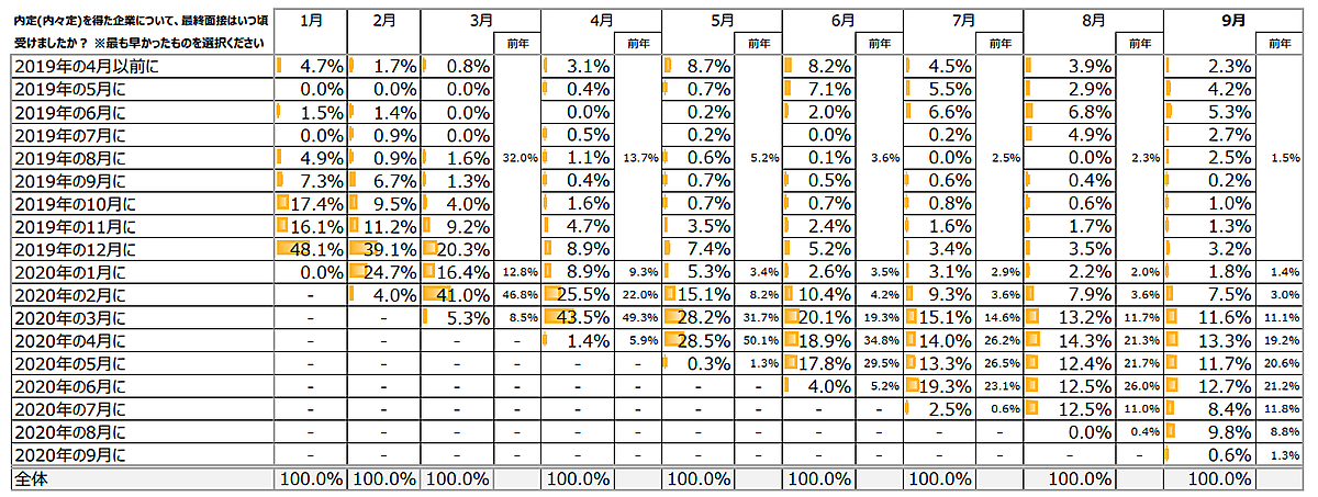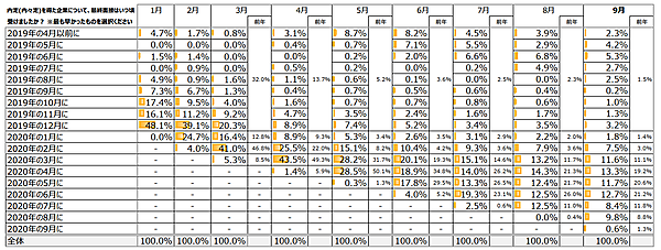 内定(内々定)を得た企業について、最初の接触タイミング・最後の接触タイミングを調べるため、まず「インターンシップエントリやプレエントリしたのはいつ頃か」を聞くと、前年と比べ早くなっている。2月までに「61.5%」がアクションしており、前年の「53.8%」を7.7ポイント上回っている。一方で「最終面接はいつ頃だったか」を聞くと、緊急事態宣言が発出された4月以降が、前年に比べて大きく落ち込んでいる。