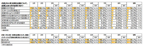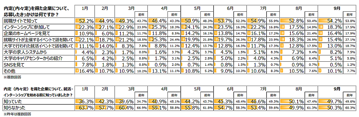 なお、「内定(内々定)を獲得した企業との出会いのきっかけ」では、「就職サイト(インターンシップサイト)」54.2%が最多で、2位の「インターンシップで知って」18.3%と大きく差を付けた。前年との比較では、「就職サイトが主催するイベントで話を聞いて」「大学で行われた就活イベントで話を聞いて」の2つは、前年から大幅減少している。