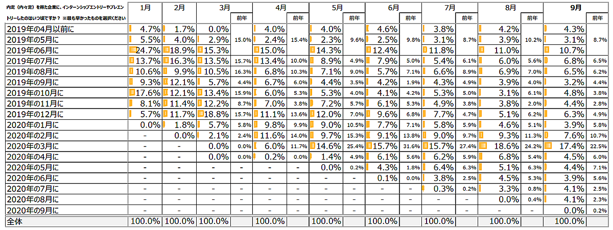それによると、内々定率は76.2%で、前月から7.1ポイント上昇していたが、2019年9月の87.7%からマイナス11.5ポイントとかなり低い。2019年比では7月(74.4%)に近い水準に留まっている。なお就職活動率は29.3%で、前月から10ポイント以上低下し、多くが活動を終えたことがうかがえる。