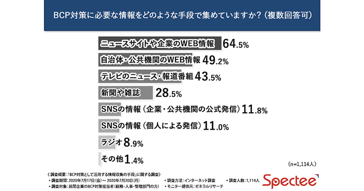 Spectee(スペクティ)は、「BCP対策として活用する情報収集の手段」に関する調査結果を発表した。全国の民間企業のBCP(事業継続計画)対策担当者(総務・人事・管理部門)1,114人が回答している。