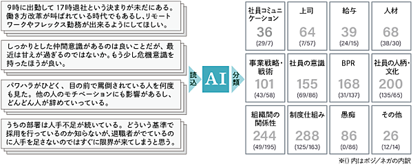 AIによる自由回答の定量化によって「事業戦略」「上司」「給与」などに分類した意見カテゴリーごとの前向き・後ろ向きや、部署別・属性別の比較ができるようになり、組織の強みや内部の課題が分かる。得られる発見が大幅に増えると同時に調査の設問数を減らして従業員の負担を軽減する。過去の調査を読み込ませて時系列で分析することも可能。