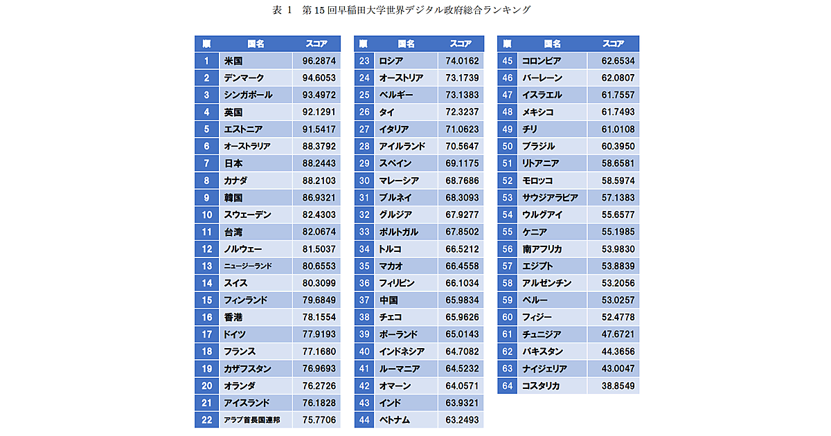 早稲田大学 電子政府・自治体研究所は「第15回 早稲田大学 世界デジタル政府ランキング」を発表した。世界のICT先進国64カ国政府におけるデジタル化の進捗度を、主要10指標(35サブ指標)で多角的に評価し、ランキング化している。