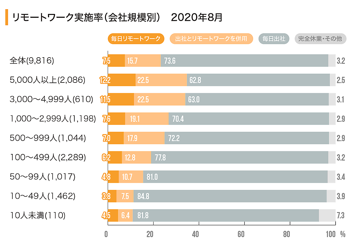 まず「リモートワークの実施状況」を聞くと、「毎日リモートワーク」7.5%、「出社とリモートワークを併用」15.7%で、実施率は計23.2%だった。前回の2020年5月調査時点では「毎日リモートワーク」17.4%、「週に2~3日出社し、その他はリモートワーク」18.1%で、実施率は計35.5%だった(回答文言に変更あり)。リモートワーク実施率は、5月から8月の約3か月で、12.3ポイントと大きく減少していた。 一方「毎日出社」が15.1ポイント増加し73.6%に達した。