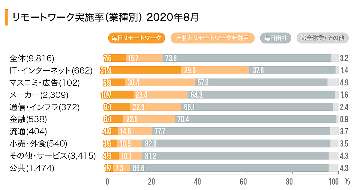 リモートワーク実施率、5月の35.5%から約3か月で12.3ポイント減少し23.2%に