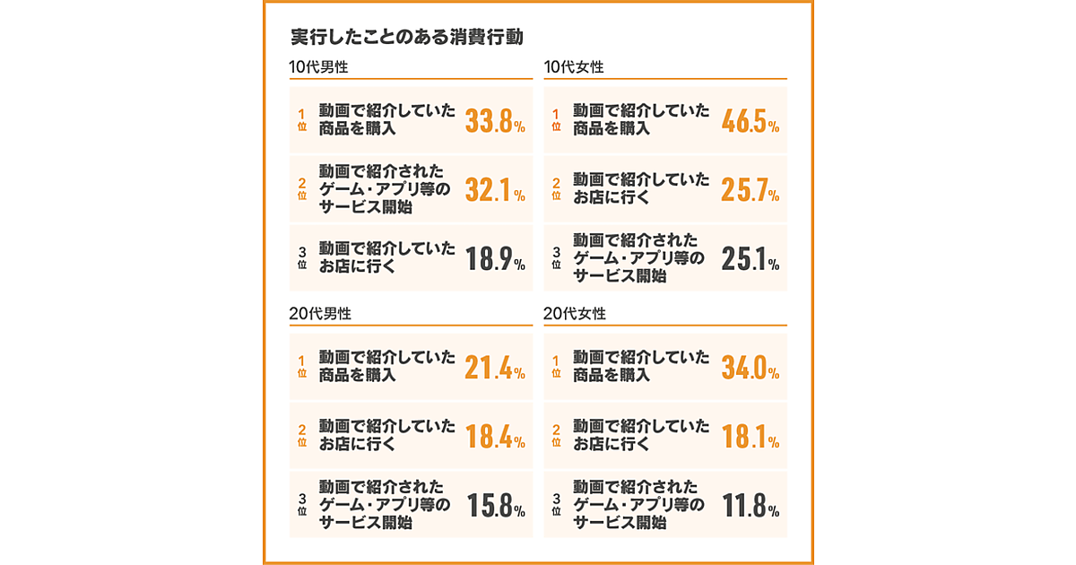 そこで、「実際にYouTuberの動画を見て、なにか消費行動を起こしたことがあるか」を聞くと、「実行したことがある」は10代69.9%、20代55.7%と、いずれも半数を超えた。具体的な行動では、性年代問わず「動画で紹介していた商品を購入」がもっとも多く、強い商品訴求力・購入喚起力を持っていることがわかる。また男性よりも女性のほうが商品を購入しているが、これは人気のコスメ・美容品を参考にしているケースが多いと考えられる。