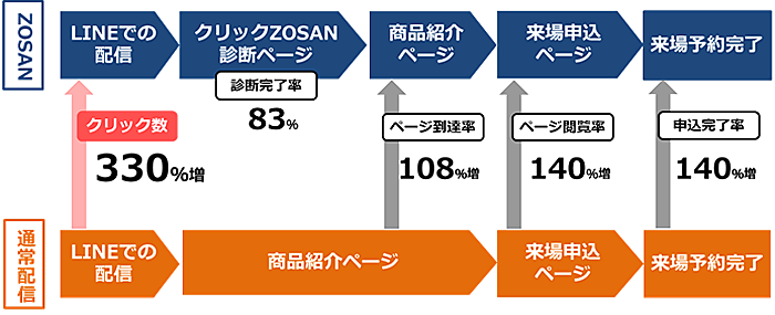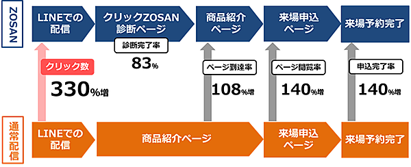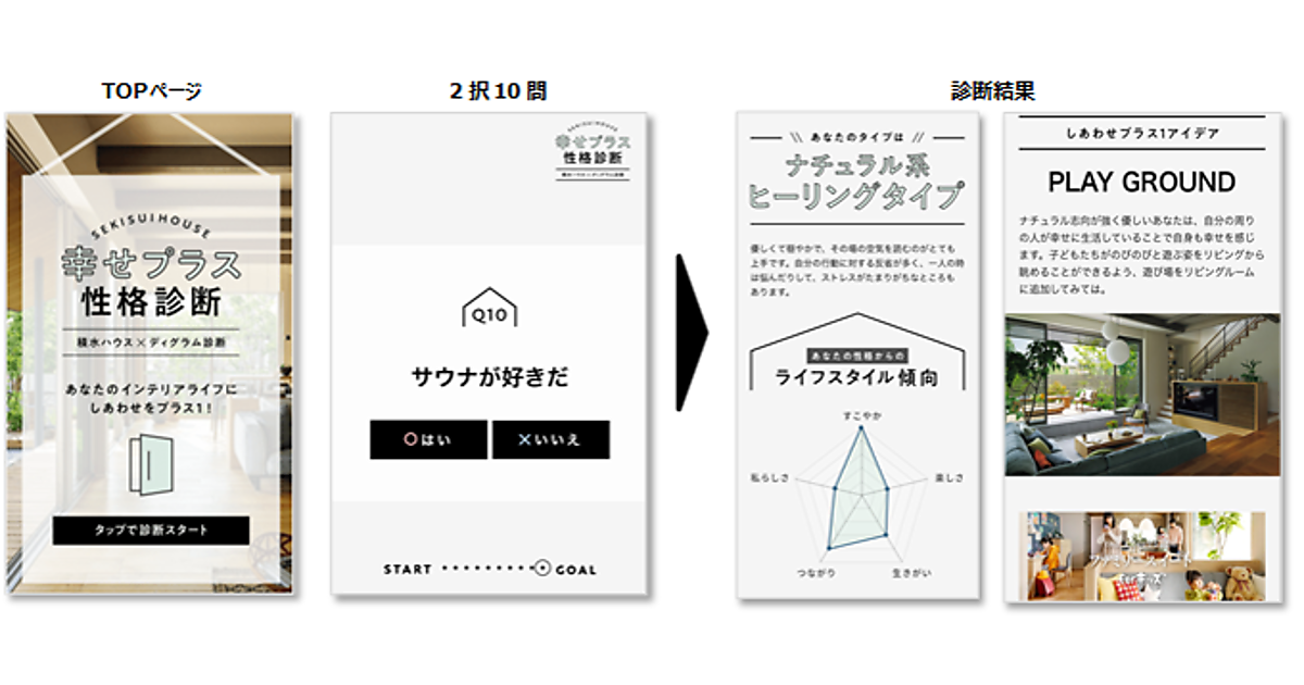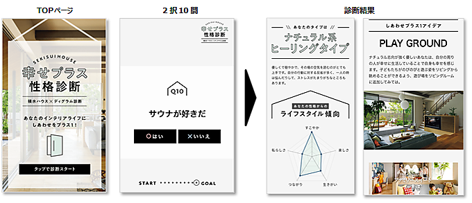 積水ハウスとの実証実験では、10個の質問に回答すると9つの性格から該当するタイプと、お勧めインテリアの提案結果を表示。休眠中のLINEの友だちがクリックして、性格診断をした後に商品検索が活発になった。通常配信とのABテストでクリック数は3.3倍、来場予約は1.4倍になった。初めてクリックしたユーザーが全体の約3分の1に達している。