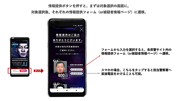画像解析・生成技術を使い、容疑者の過去の写真から今の姿を予測。重要指名手配容疑者12人のうち5人を公開した。顔をクリックするとAIによるシミュレーションと体型変化を加味して容疑者一人につき9パターンの予測イメージが閲覧できる。各容疑者の画像から担当する警察署の情報提供フォームに遷移し、目撃情報などを通報できる。