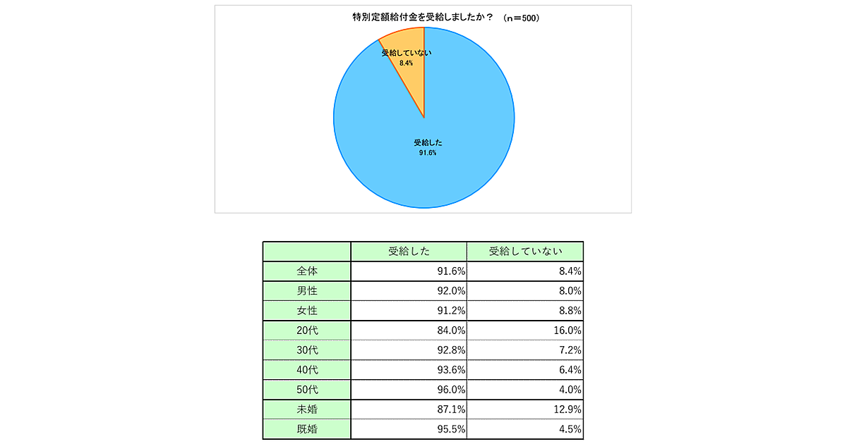 まず「特別定額給付金を受け取りましたか?」と聞くと、「受給した」91.6%、「受給していない」8.4%。性別・年代別・未既婚別では、年代別で「20代」84.0%が平均より低く、お金に困っていることが多いとされる若年層ほど、数値が低いという結果になった。未既婚別においても「未婚」87.1%のほうが「既婚」95.5%より低い。