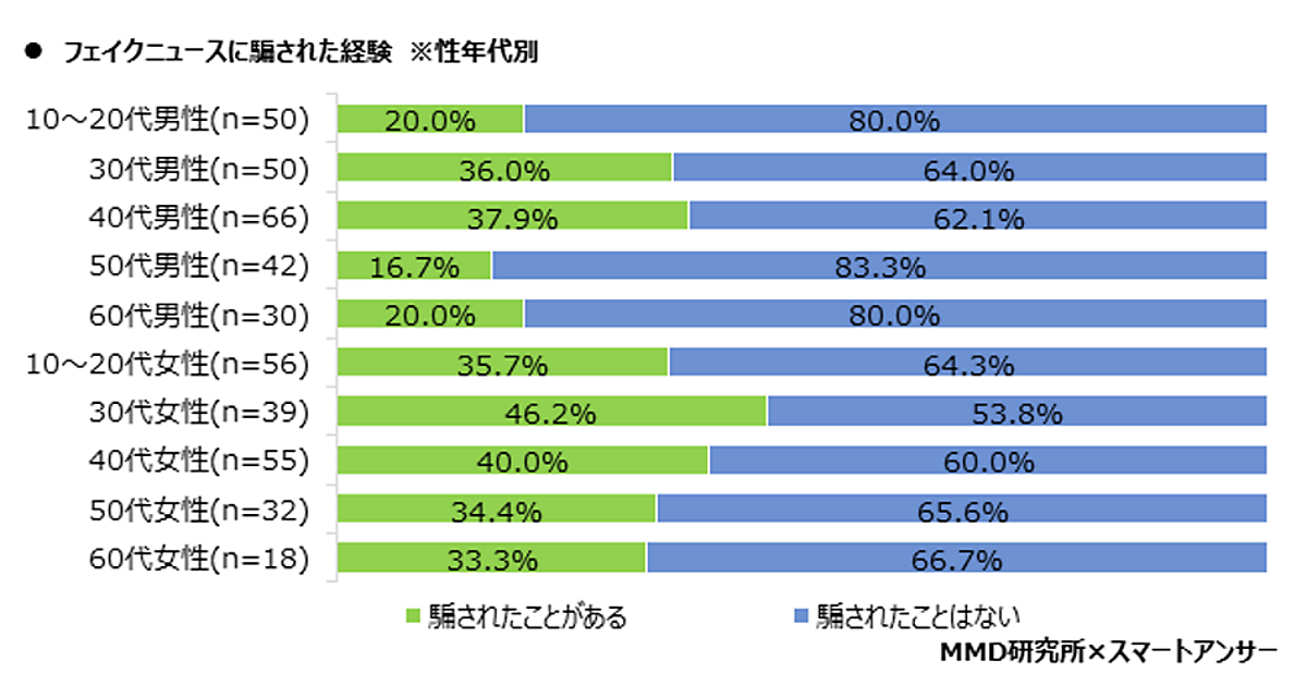 「フェイクニュースに騙されたことはない」10・20代男性と50代・60代男性が高い