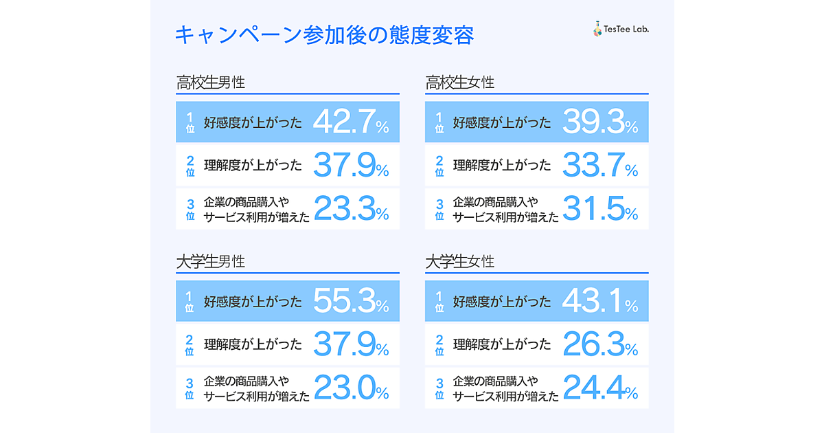 「キャンペーンに参加した後の、行動やその企業に対する印象」について聞くと「好感度が上がった」という回答がすべての性年代で最多。「理解度が上がった」がそれに続いた。「その企業の商品購入やサービス利用が増えた」も一定数存在しており、売上への貢献も期待できそうだ。