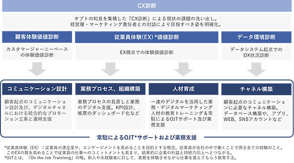 デジタルマーケティング事業のオプトは、企業の顧客体験価値改革に向けた「CX(カスタマーエクスペリエンス)改善サービス」を始める、と10月22日発表した。企業活動の診断を基に、戦略立案、組織構築、人材育成、実行を一括して支援する。データの適切な活用を目指す企業を対象に、顧客体験価値向上のための施策を支える。