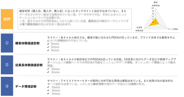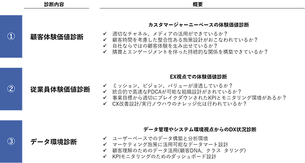 CXの最適化にはデータ環境とEX(従業員体験価値)の最適化が必要不可欠なことから、CX改善サービスではサービス・商品の典型的なユーザー像(ペルソナ)の行動・思考・感情などの動きを時系列で捉えるカスタマージャーニーをベースに、顧客体験価値の状況を可視化。改善に必要なデータ環境や組織設計ができているか診断する。