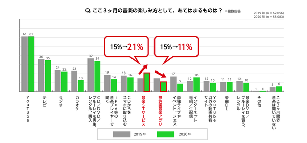 前年の2019年9月の調査では、「直近3か月の音楽の楽しみ方」について「無許諾音楽アプリ」と15%が回答していたが、今回の調査(n=55,083人)では11%まで減少していた。特に10代・20代の利用が減少を示したという。一方「音楽ストリーミングサービス」の利用が、前年の15%から21%と上昇しており、ちょうど入れ替わった形だ。なお「単独ライブやイベント、フェス」「カラオケ」が10ポイントほど減少しているが、これは新型コロナの影響と考えられる。