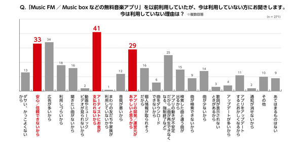 そこで、過去に無許諾音楽アプリを使ったことのある利用経験者(n=271人)に、「利用をやめた理由」を聞くと、「アーティストにお金が支払われないから」41%が最多。続いて「安心/信頼できないから」33%、「アプリの開発/運営元があやしいと思うから」29%が続く。ベースとして違法性や開発元への不信感があるが、それ以上に“アーティストを正当に応援したい”という気持ちから、利用を止めているようだ。