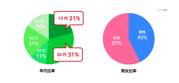 一方で、無許諾音楽アプリを利用している人もまだまだ多い。音楽を楽しむのに無許諾音楽アプリをもっとも使っている人(最頻利用者、n=1,389人)を年代別で見ると、20代が31%で最も多い。また男女別では女性のほうが57%と男性より多い。