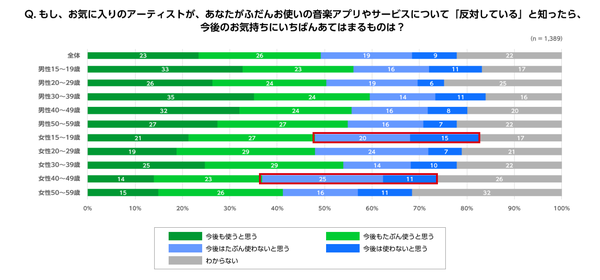 最後に「お気に入りのアーティストがふだん使っている音楽サービスの利用を反対していると知ったら、どうしますか?」と聞くと、無許諾音楽アプリの最頻利用者の約3分の1が「今後は使わないと思う」と中止の意向を示した。特に10代女性・40代女性で、利用を止めるという人が多かった。