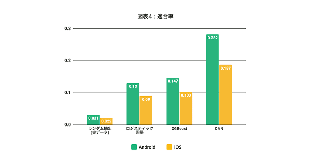具体的には、「インストール後から1週間(観察期間)」の行動データを用いて、「その後4週間(予測期間)」に課金行動を一度でも行うかどうかを、二値分類問題として予測した。ユーザー数はAndroidは23万3,521人、そのうち課金ユーザー数は3.12%。iOSは43万1,043人、そのうち課金ユーザー数は2.16%。約80%が訓練ユーザー、約20%が評価ユーザーとしている。