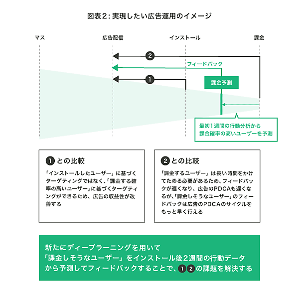 この結果は、「より課金サービスの利用が見込めるユーザーを獲得するために、広告配信の最適化が行える」こと、課金見込みユーザーにクーポンを発行したり、ゲーム内で優遇したりすることで、「通常のフィードバックでは届かなかった、課金見込みユーザーへのリーチが期待できる」ことを示唆している。広告配信以外への応用が期待される。