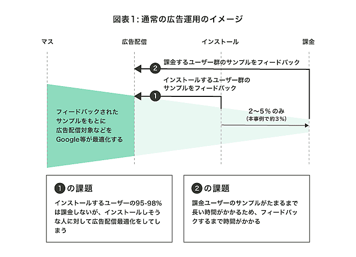 コンバージョンを「インストール」にした場合、デジタル広告は、課金しないユーザーも含めて増やすよう最適化されるため、過剰な広告費を投下している可能性が高い。コンバージョンを「課金」にすれば、広告の費用対効果が大きく改善する可能性があるが、ユーザーが実際に課金サービスを利用するまでにはタイムラグがあり、PDCAを回すのに時間がかかる。