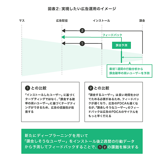今回の研究レポートでは、インストール後から短期間のユーザー行動から、その後の課金行動を予測し、課金ユーザーを効果的に誘導できている広告を早期に把握。その分析結果を配信広告の運用に活用することで、広告のPDCAを高速化できるか検証している。