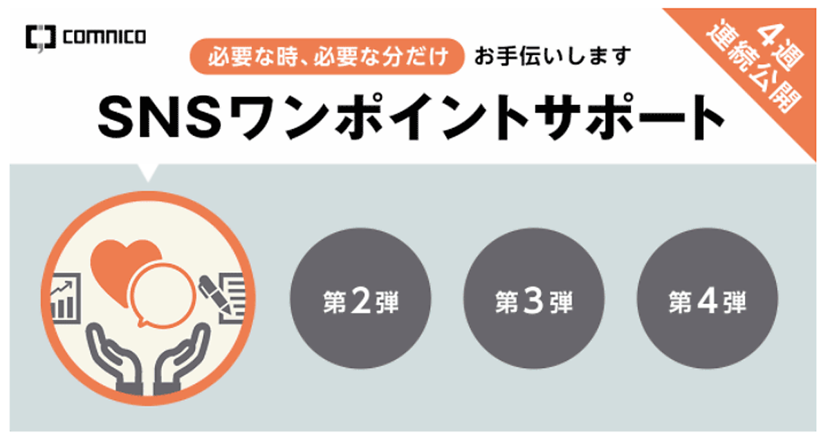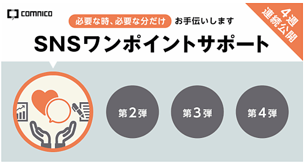 SNSワンポイントサポートは、SNSアカウント運用の一部をコムニコが行うサービス。月額5万円からで、全面的な支援より予算が抑えられる。初期構築やイベント時など短期間でも可能。想定するのは、投稿用テキスト・クリエイティブの提案・校正▽投稿用写真の撮影▽広告プランニング・運用アドバイス▽マニュアル作成--など。