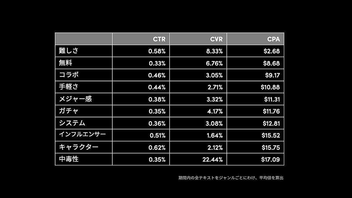 同一の動画でもテキストを変えると45%の素材でCVRが1%以上高くなった。10系統あるゲーム広告のテキストのうち、CPA(顧客獲得単価)の低いゲームアプリで多用される「難しさ」はCVRが高くなるが、「キャラクター」や「インフルエンサー」ではCTRやCPAが高くなり、どの系統のテキストを使うかでCTR、CVR、CPAに違う傾向が現れる。