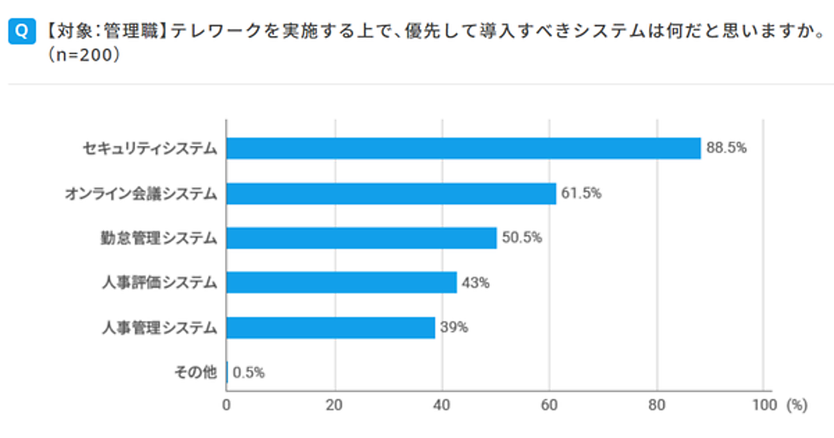 一方で、「テレワークを実施する上で、優先して導入すべきシステム」を管理職に聞くと、「セキュリティシステム」88.5%がもっとも多く、「オンライン会議システム」61.5%、「勤怠管理システム」50.5%を上回っている。