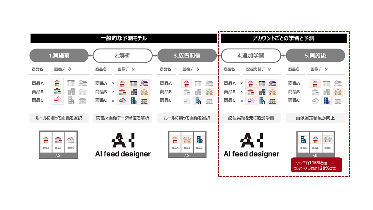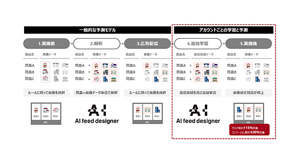 2019年3月提供の「AI feed designer」は、配信実績を元にA/Bテストの前から表示される最適な商品画像を選ぶ配信前予測の機能を備えた。今回のPlusでは、配信実績を元に追加学習をかける新機能で効果予測の精度をさらに高めた。広告主が保有するデータを元に複数の画像素材から最も予測CTR(クリック率)が高い画像を選ぶAIモデルを実装した。