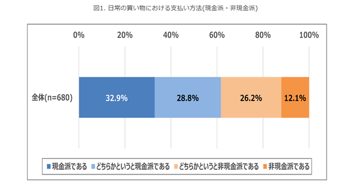 まず、日常の買い物における支払い方法を、現金派か非現金派かで聞くと、「現金派である」「どちらかというと現金派である」は計61.7%、「どちらかというと非現金派である」「非現金派である」は計38.3%で、約6割が現金派だった。