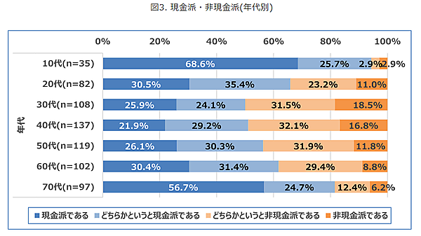 一方、40代以上は年代があがるにつれ「現金派である」「どちらかというと現金派である」の割合が高まり、70代では「現金派である」「どちらかというと現金派である」が約8割に達した。