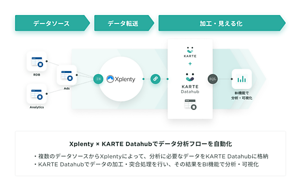Xplentyは、100以上のデータストアとSaaSアプリケーションの統合をサポートするプラットフォーム。KARTE Datahubは、顧客データや行動データ、オフラインデータなど分断されているデータベースを統合し、顧客を深く知ることでCX向上の実現につなげるプラットフォーム。連携によって、より精度の高いデータ分析が可能になり、業務が効率化する。