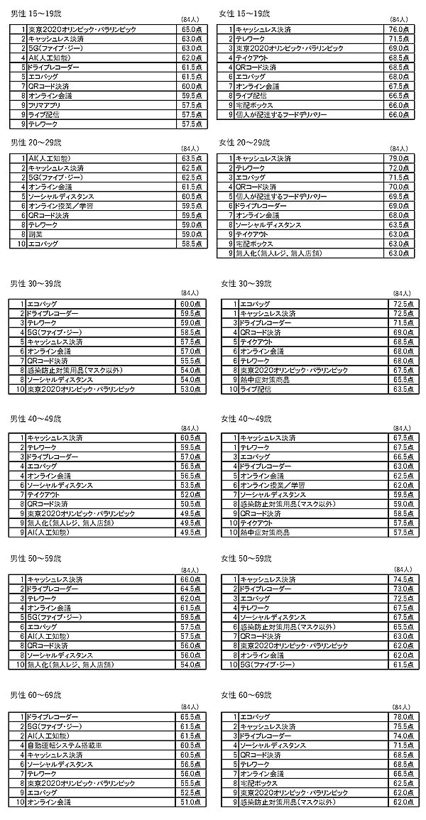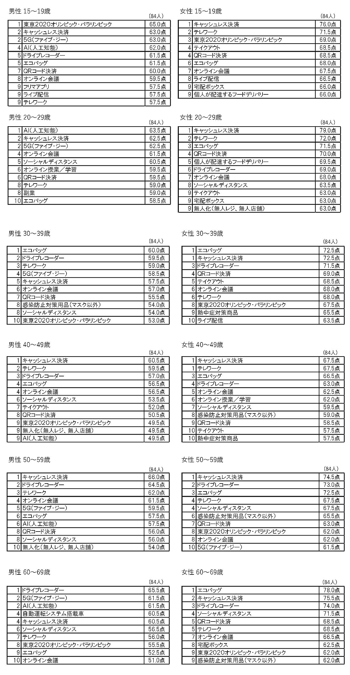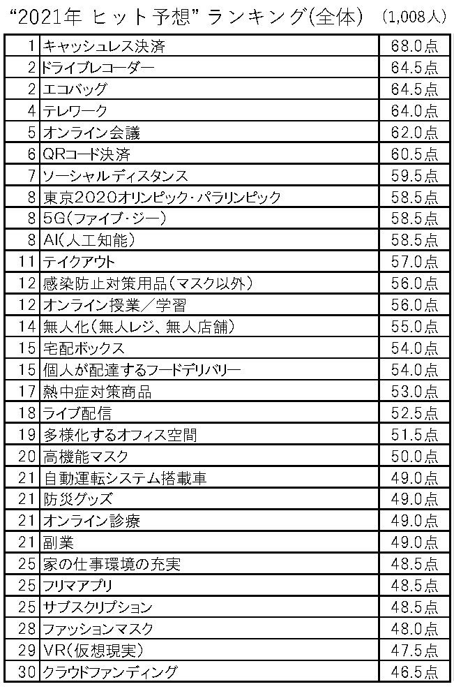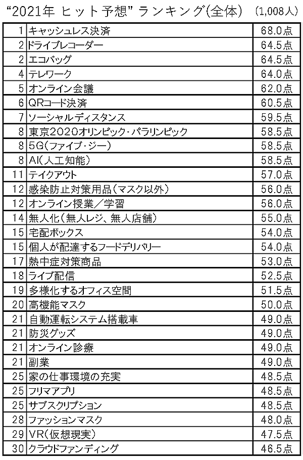 その結果、「2021年ヒット予想」の第1位は「キャッシュレス決済」68.0点となった。2位・3位には「ドライブレコーダー」「エコバッグ」が64.5点同点で続いた。いずれも来年2021年以降に急ヒットするというアイテムではなく、すでに2020年に急拡大したヒットアイテムが上位を占めた。